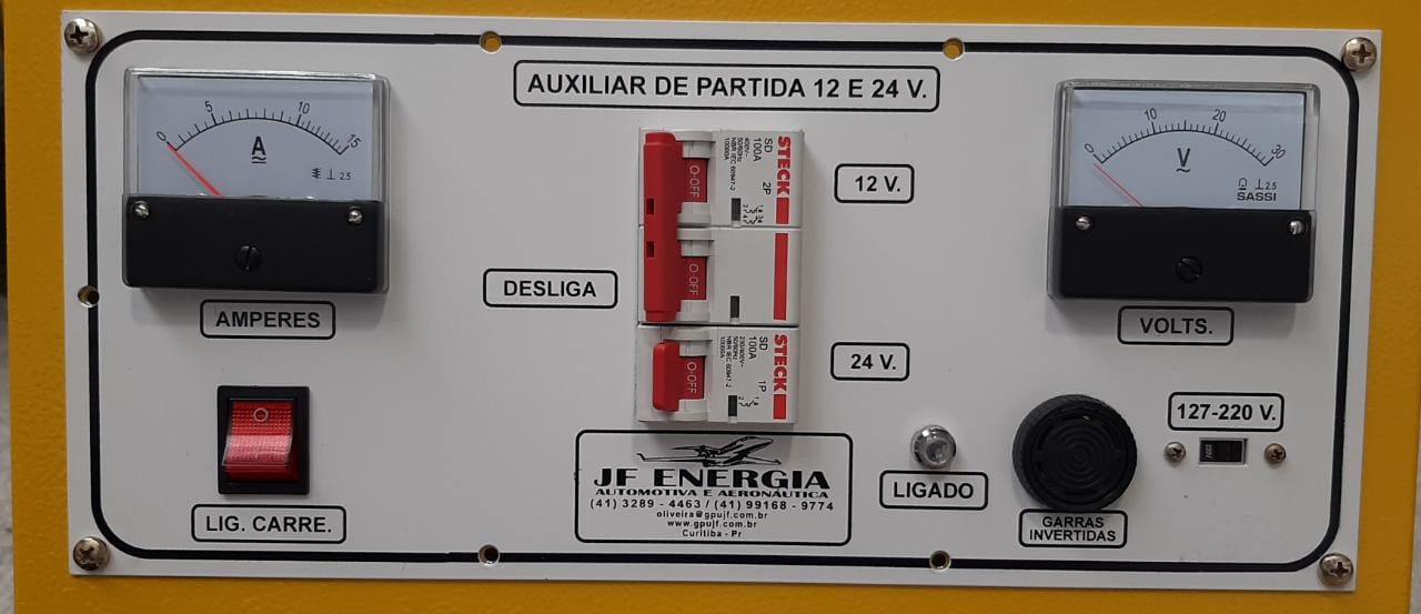 -Painel com voltímetro digital,amperímetro,chave de mudança de voltagem 110/220v. e disjuntor de mudança 12 / 24v. indicador luminoso de chave ligada,baterias carregando ,baterias carregadas, fusível de entrada e fusível de saída do carregador.