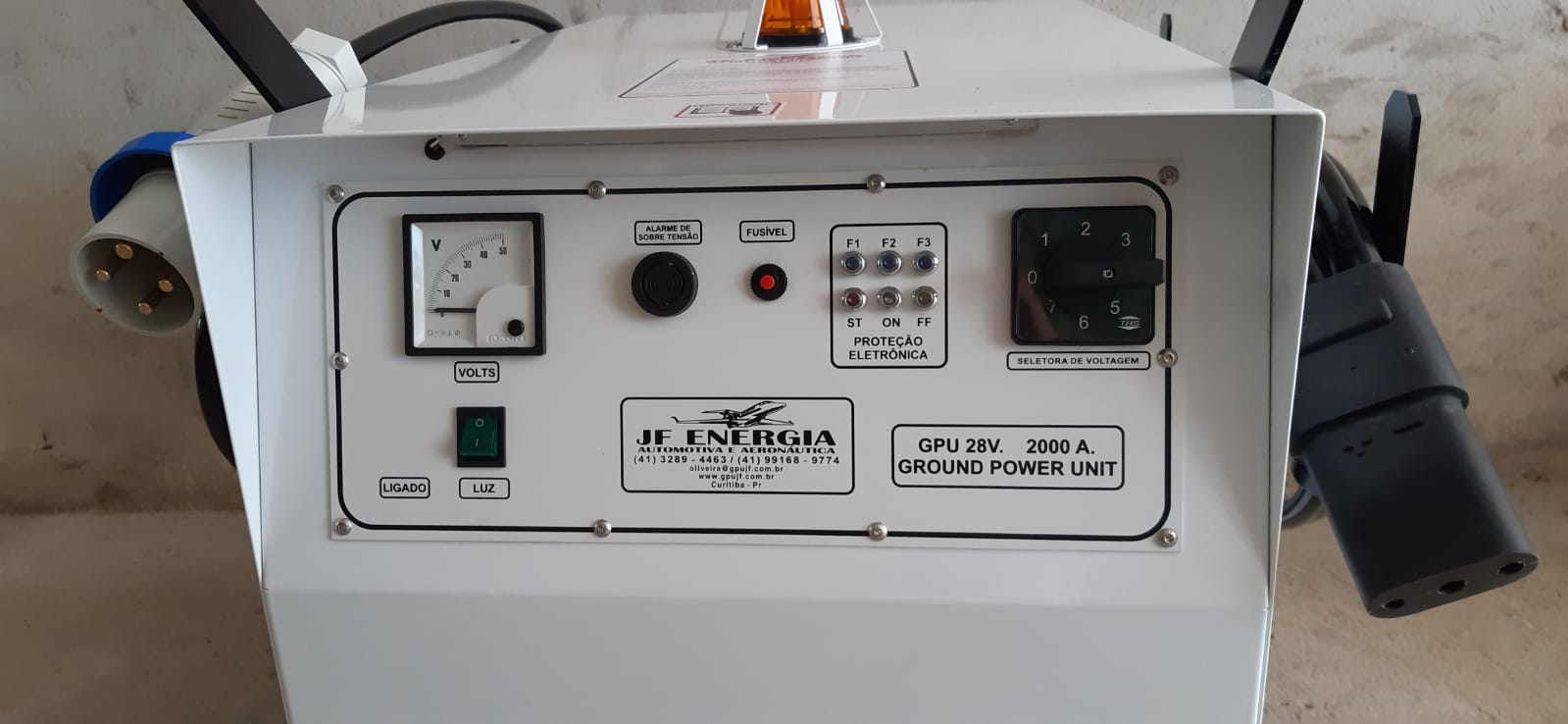 ENTRADA: 220/380v. trifásica 60hz. SAÍDA: VDC 26 a 32v. ajustável com chave seletora de 7 posições. CORRENTE MÁXIMA DE SAÍDA: 2000cca de pico. CABO DE ENTRADA: 4 x 10mm x 20m. CABO DE SAÍDA 2 x 95mm x 5m emborrachado flexível com plug 28v. padrão aeronáutico JF. Peso aproximado: 180 kg.