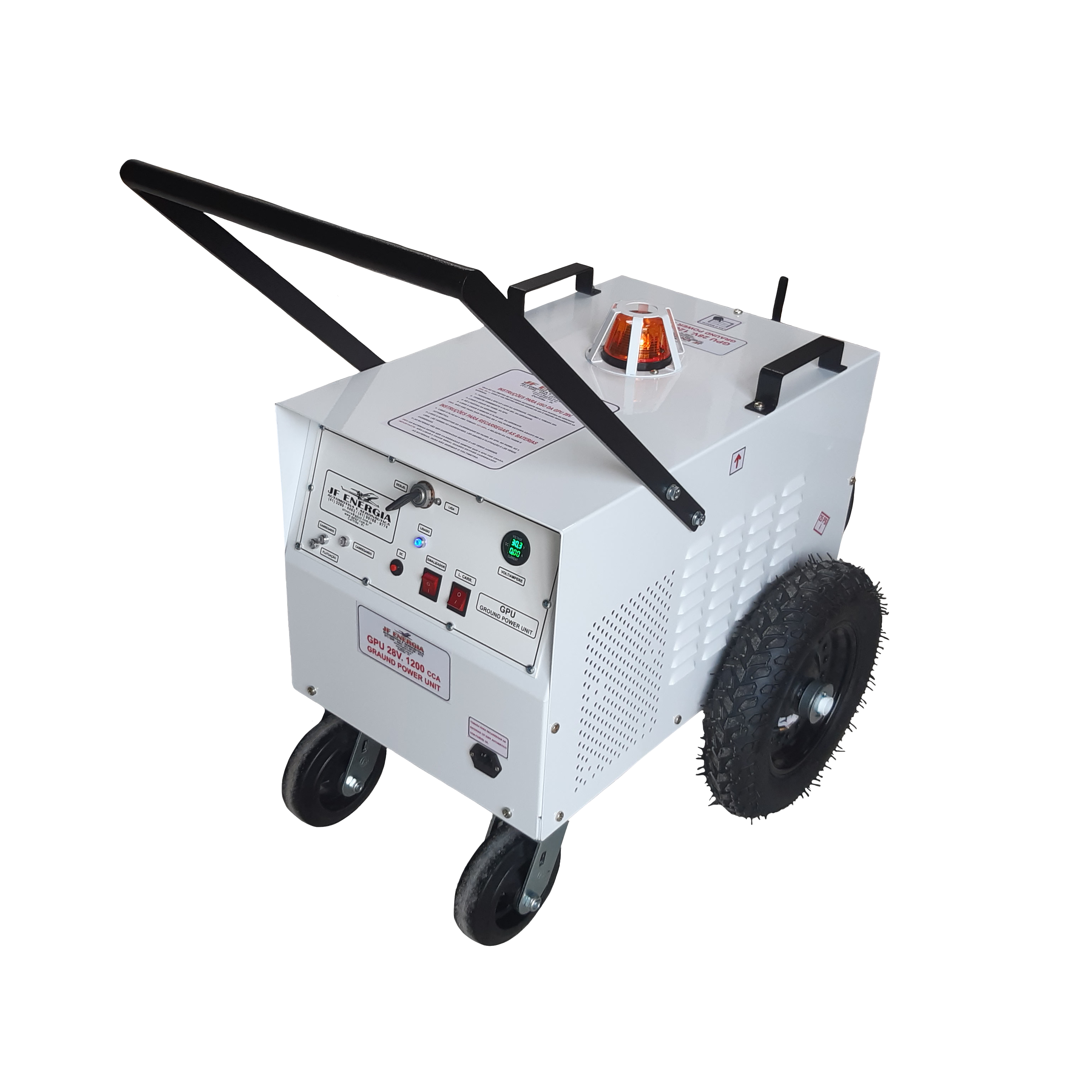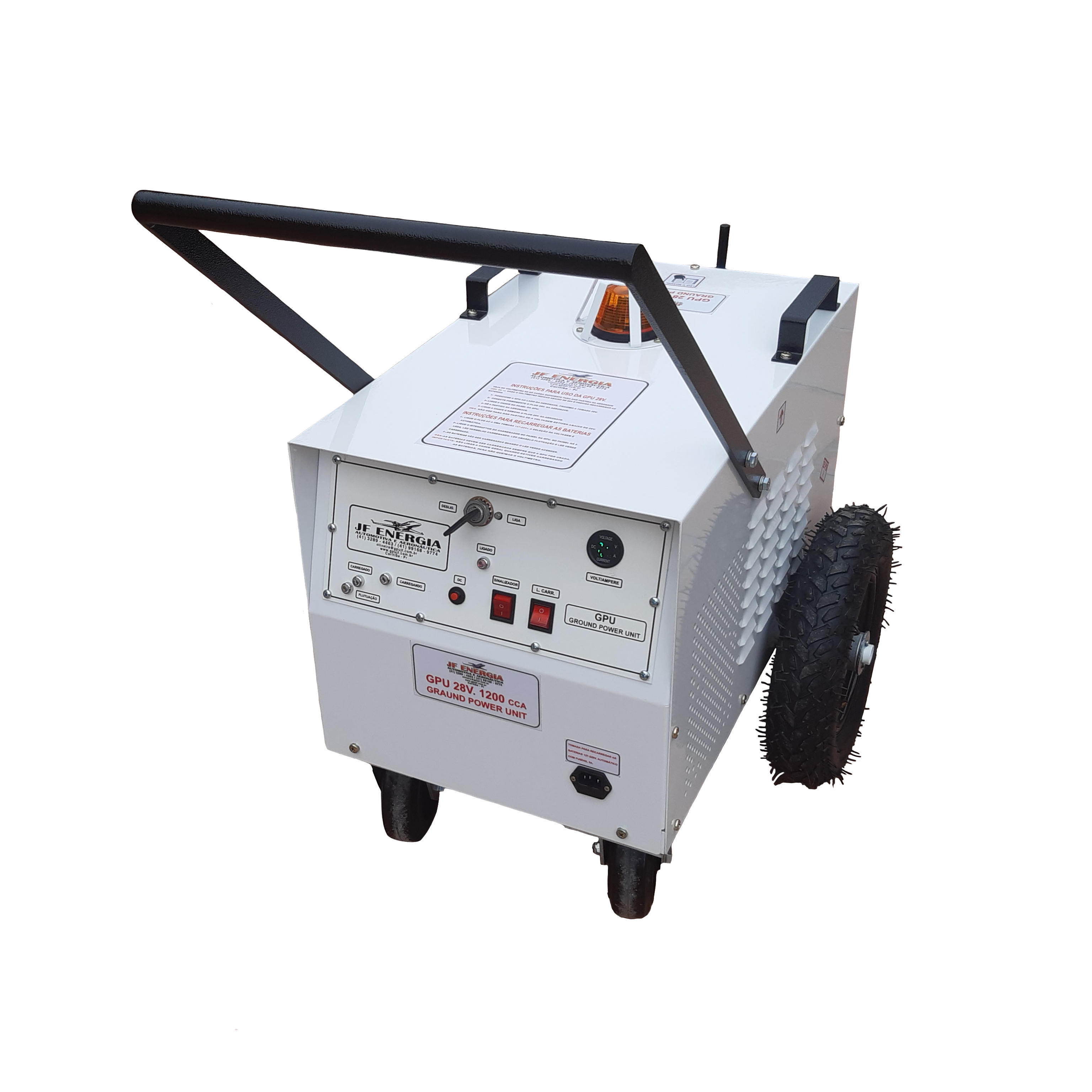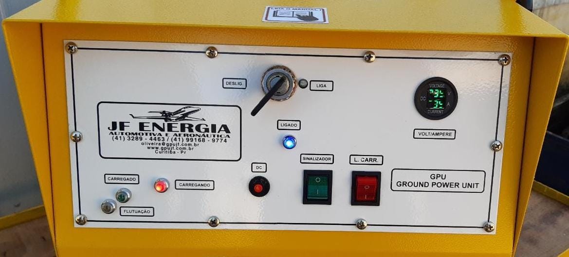 É um Gpu Fonte Externa 30v. com baterias com capacidade de partida ( 5 a 12 partidas dependendo da aeronave),ideal para uso em pequenos aeroportos e fazendas, onde não tem rede elétrica trifásica para uso de um Gpu elétrico É indicado para aviões agrícolas com motor turbo hélice ( Air Tractor,Thrush entre outros).Possui painel de controle com amperímetro indicador de carga do carregador ,voltímetro digital indicador da voltagem de saída das baterias,carregador com desligamento automático chaveado eletrônico de 3 estágios não danifica as baterias por excesso de carga.Chave geral do cabo de saída ,indicador luminoso de baterias carregando,baterias carregadas,chave ligada,fusível de proteção de entrada do carregador e fusível de proteção de saída do carregador e sinalizar pisca-pisca com circuito eletrônico.Gabinete fabricado em chapa de aço 1,5mm de peso reduzido e pintura epóxi,composto de chassi,painel,tampa traseira e tampa superior,produzido com moderna tecnologia de dobra CNC e furação a lazer.Rodado composto por 2 rodas pneumáticas de 14” com rolamento e 2 rodízios giratórios de borracha moldada de 6″.Tensão de entrada do carregador 127/220v.com chave no painel,cabo de entrada tipo computador 3 x 1,5mm x 1,5m.Cabo de saída 70mm x 2m. com plug padrão aeronáutico 28v.marca JF.